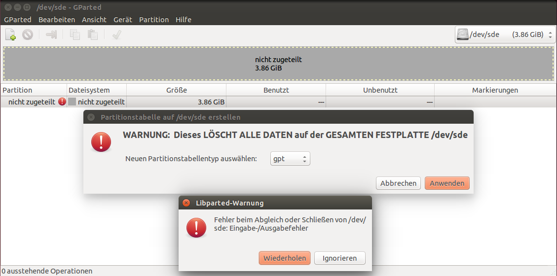 GParted -> Problem beim Einlesen (E/A-Fehler) und Wiederherstellungsversuch, Größe falsch.