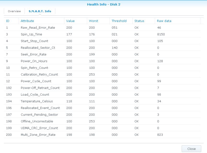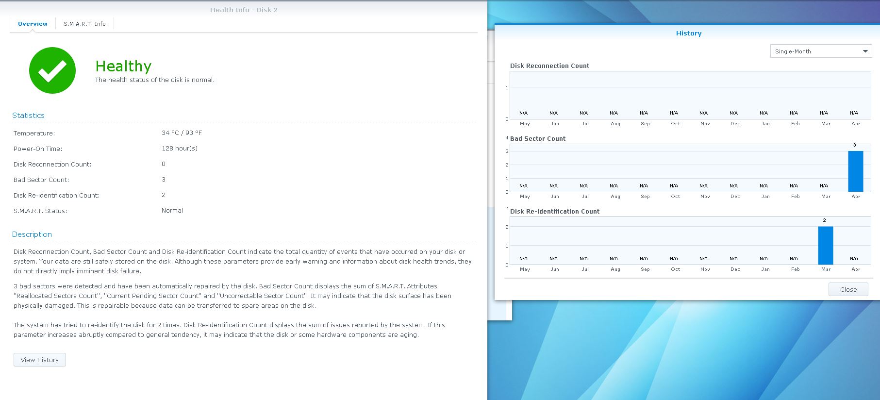 ich habe mein NAS erst seit knapp 2 Monaten. Ich hab es selbst mit zwei WD RED 4GB bestückt (auch 2 Monate alt). Laut NAS hat die zweite der beiden Platten I/O Fehler und defekte Sektoren nach 128 Stunden betrieb (siehe Bilder). Dabei hab ich noch gar keine Daten auf diese Platte übertragen (sollte die interne Backup Platte werden).