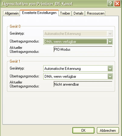Ich habe zum obigen Problem und zu diesem auch noch ein Printscreen angefügt. Hat das untere mit dem oberen was zu tun? Wie kann ich die Festplatte wieder auf DMA umstellen?
