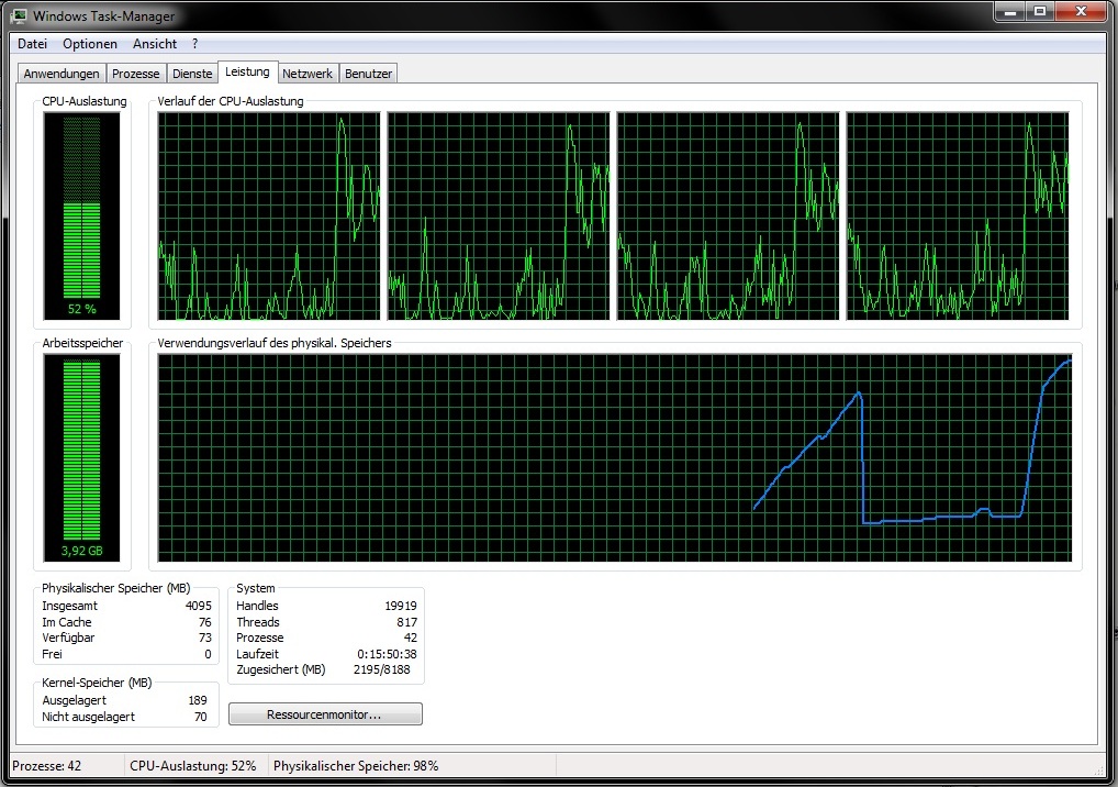 Die explorer.exe steht dann dauerhaft bei 25% CPU Leistung (irgendwie erreicht nie ein Prozess sondern immer nur 25? Liegt das am Quadcore?) und innerhalb von ein paar Sekunden ist der Arbeitsspeicher voll.