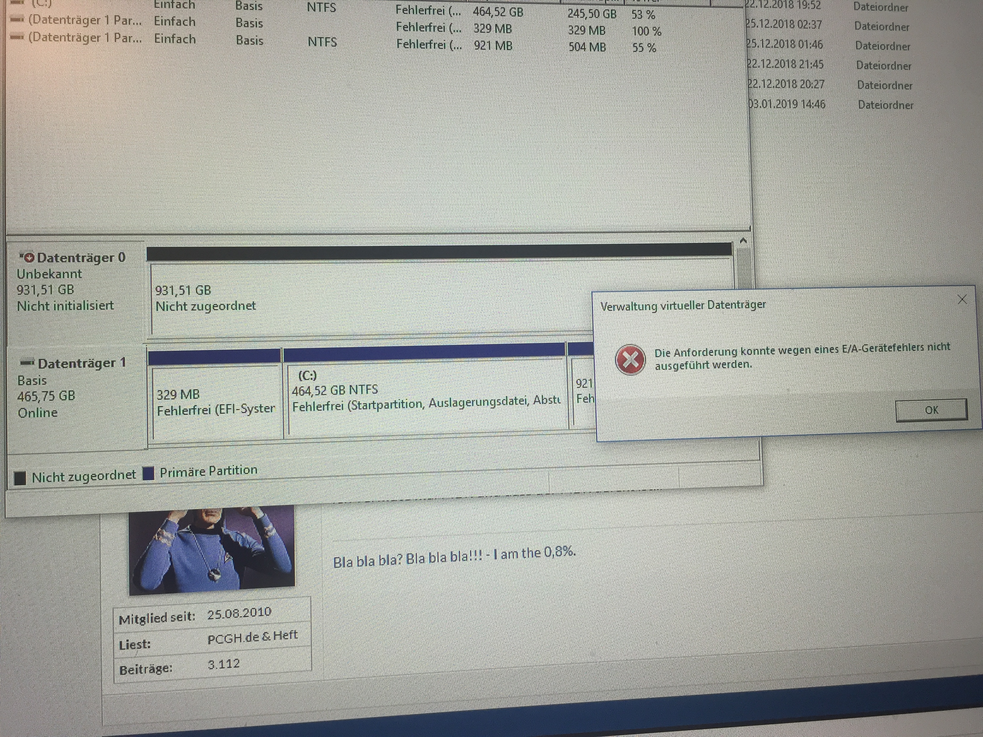 Aber wenn ich in der Verwaltung DatenträgerInitialisierung klicke kommt nur ,Die Anforderung konnte wegen eines E/A-Gerätefehlers