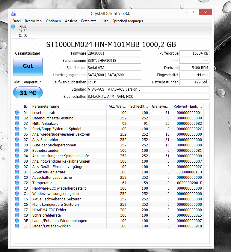 Was auffällt sind die viele G-Sensor Auslösungen, entweder steht die Platte auf einem Rütteltisch, ist in einem Notebook welches viel zu grob behandelt wird (da der obere Teil abgeschnitten wurde, kann man ja nicht erkennen um welche es sich handelt) oder der Sensor ist defekt. Das dürfte auch den Lese- und die Schreibfehler erklären. Für die vermutlich grobe Behandlung ist sie aber noch in einem guten Zustand. Ausfallen kann eine Platte trotzdem jederzeit, weshalb es Pflicht ist immer regelmäßig Sicherungskopien von den wichtigen Daten auf einem Medium in einem anderen Gehäuse wie einer USB Platte oder einem NAS zu machen.