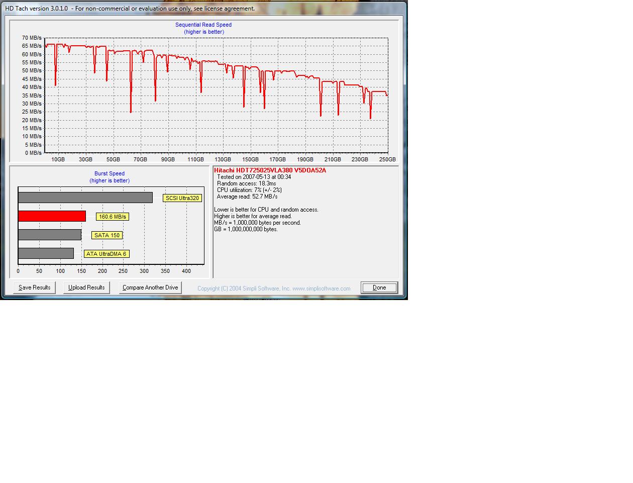 Der Kurvenverlauf ist völlig normal. Nach Hinten raus werden Festplatten halt immer langsamer. Die Aussschläge nach unten können Festplatten-Tätigkeiten oder einfach laufende Virenscanner oder dergleichen verursachen.