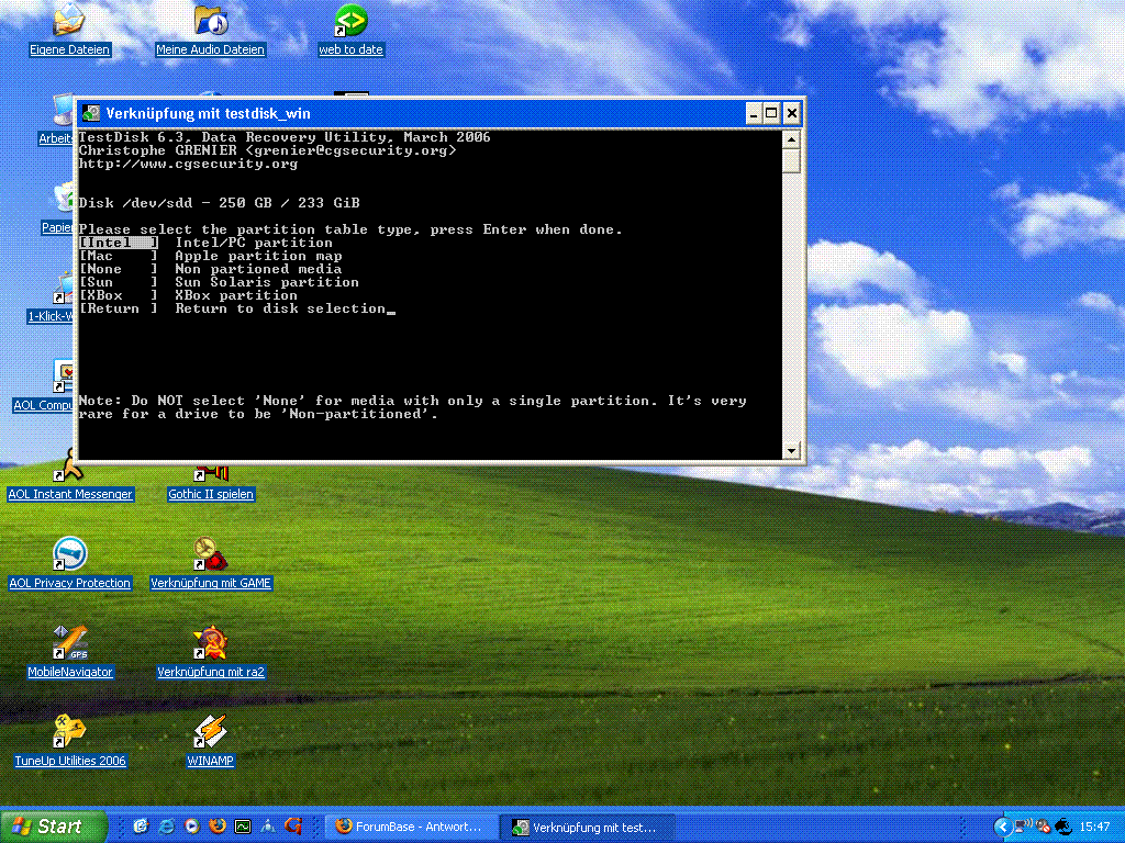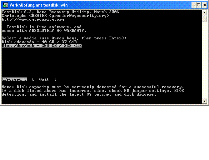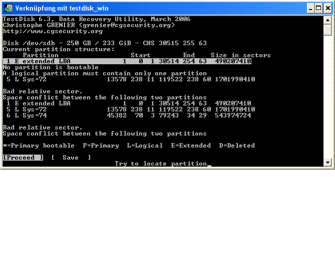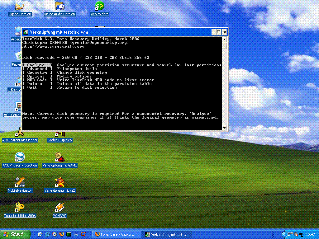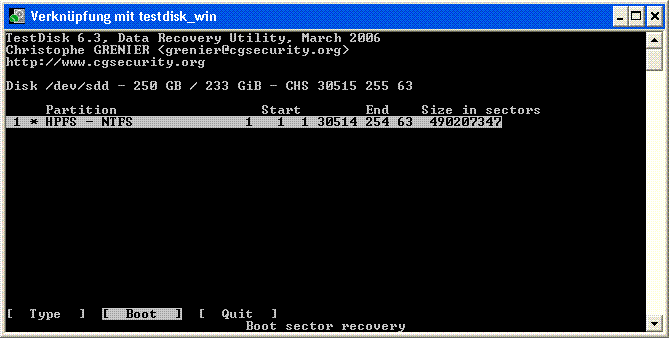 Gehe mal davon aus, dass es der 1. ist, wenn du auf Analyse gehst. Unten proceed - enter (Screen), danach alle Einträge nacheinander markieren und mit p - enter schaun, ob die Dateien ordnungsgemäss angezeigt werden (verlassen per q), ist das der Fall, continue - enter und im nächsten search - enter komplett durchlaufen lassen (Screen), danach bitte zurück zur linken Menüauswahl, auf Advanced, unten boot - enter (Screen) und danach die Ergebnisse hier online stellen.