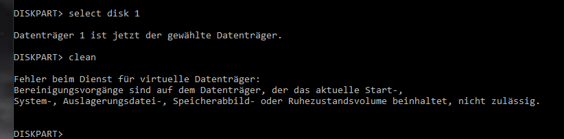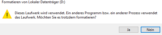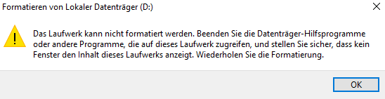 Dabei bekomme ich immer eine Meldung das die Festplatte nicht formatiert werden kann weil irgend ein Programm darauf zugreift und sie momentan benutzt wird. Habe es auch über cmd und diskpart versucht, bekomme aber auch hier eine Fehlermeldung.