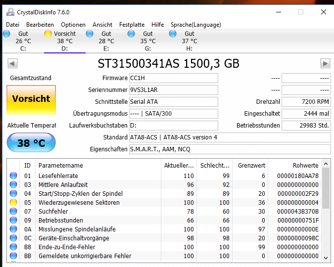 Zudem bekomme ich auch in CrystallDeskInfo eine Meldung das mit dieser Festplatte irgendwas nicht stimmt: