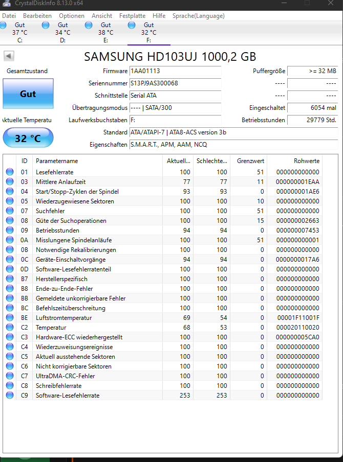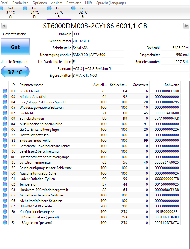 Da ich nicht weiss, von welcher Platte es kommt, habe ich mal beide Crystal-Disk Auswertungen hier gepostet. Vielleicht kann mir ja jemand einen Tipp geben, ob die demnächst die Grätsche machen.