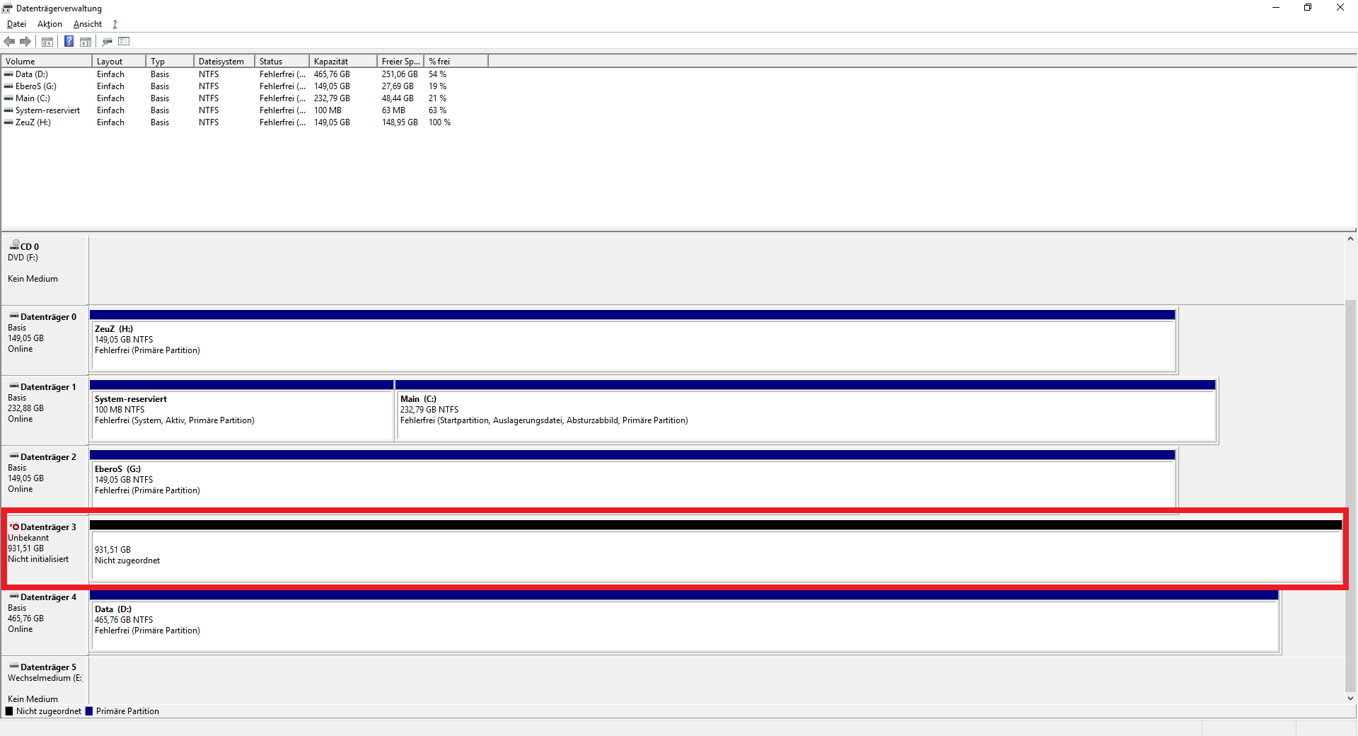 Die Festplatte taucht im Taskmanager auf und wird mit den üblichen ~930 GB angezeigt. Jedoch ist dies im Explorer nicht der Fall.