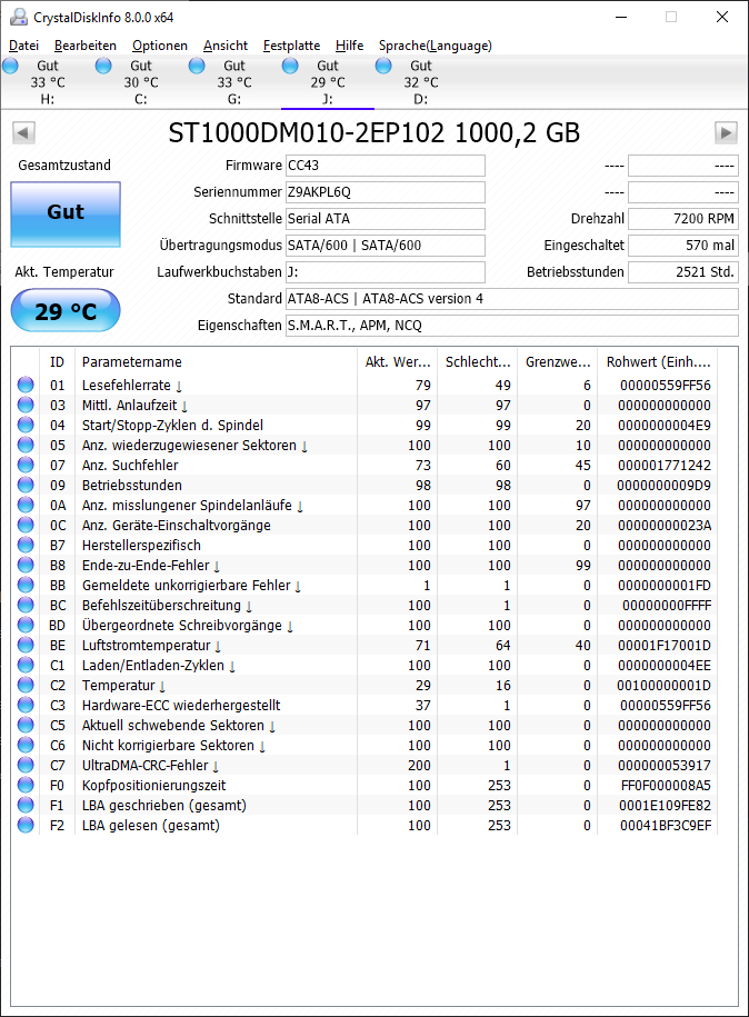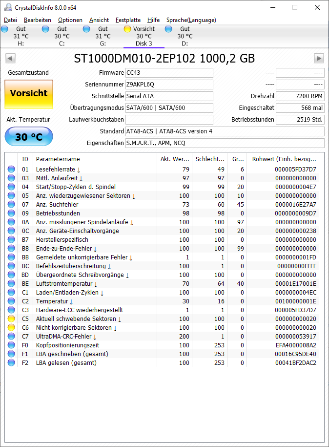 Achte auch auf den Rohwert vom Attribut C7, der zeigt das es schon mal massive Probleme mit dem Datenkabel gab. Vermutlich sind diese schon behoben, aber sollte der Rohwert vom Attribut C7 steigen, so ist das Datenkabel defekt oder ein Stecker lose.