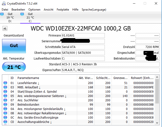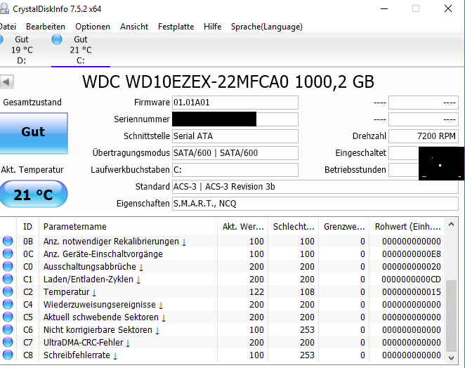 Bis vor zwei Monat verwendete ich eine 3 TB Western Digital Blue HDD als Systemplatte. Ich entschied mich zum Kauf des 1 TB Modells der Reihe. Auf dieser hab ich nur Windows und alle Programme installiert. Vor 2 Wochen begann die Platte während einer Auslastung, auch einer geringfügigen, laute Geräusche von sich zu geben. Ich habe mehrmals mit CrystalDiskInfo und mit der Windows Datenträger Fehlerüberprüfung beide HDDs untersucht. Beide wiesen keine Fehler nach und waren immer unter 35° C und somit nie sonderlich warm (Bilder angefügt). Da meiner Meinung nach die Geräusche äußerst ungesund klingen und ich so nicht arbeiten kann frage ich nun hier, ob das irgendeinen Grund hat oder ich sie möglicherweise zurückschicken sollte. Nach Möglichkeit werde ich versuchen eine Audiodatei hochzuladen.