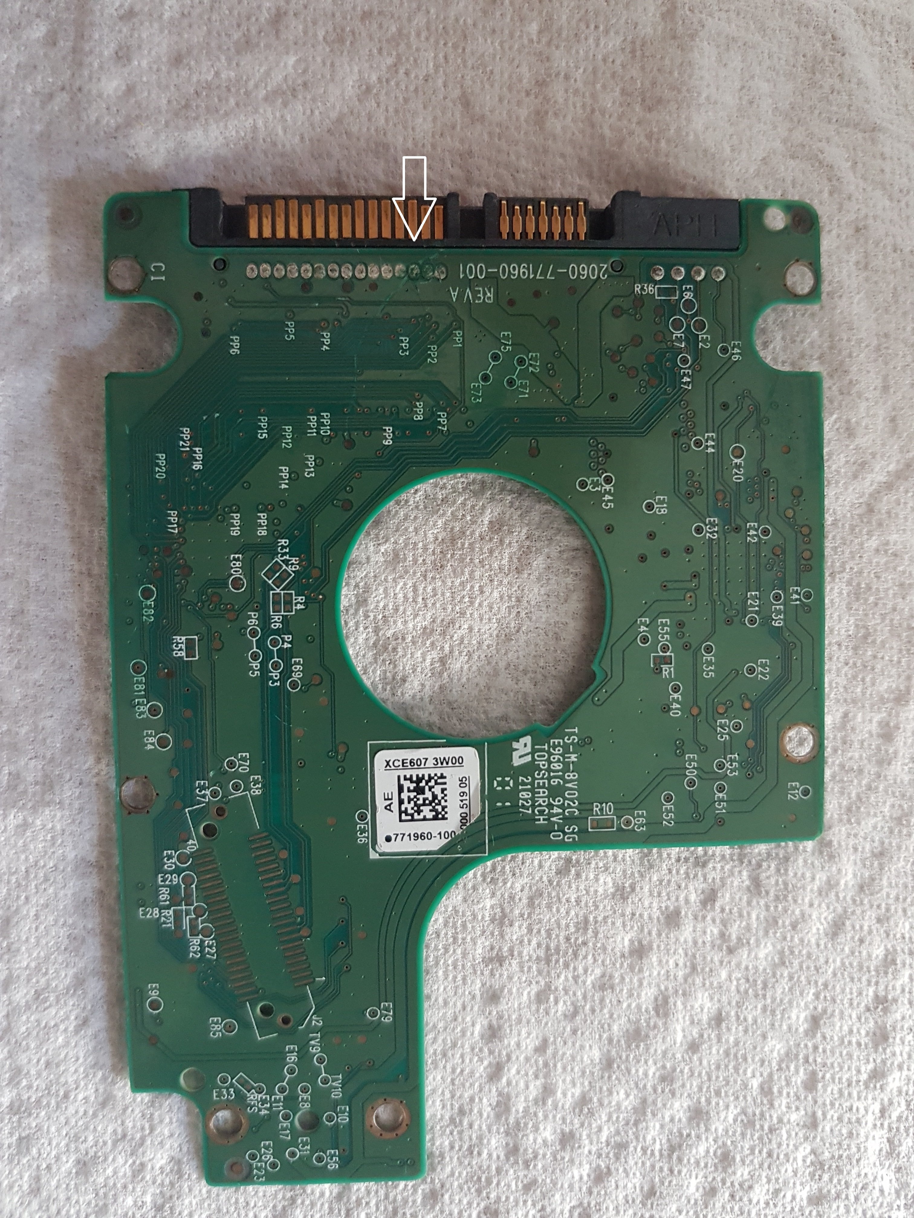 und wollte dementsprechend mal die Dioden testen. Also Festplatte ausgebaut, aber da ich keine Ahnung von Elektronik habe, weiß ich nicht wo die Dioden sind. Ein paar Stellen sehen auch verbrannt aus (mit roten Pfeilen markiert).
