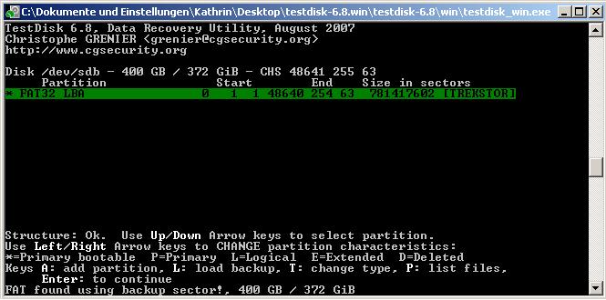 Nach einem Stromausfall wurde meine externe Festplatte (Trekstor maxi m.u mit 400GB) als nicht formatiert angezeigt, bei der Datenträgerverwaltung stand sie als RAW-Format. Bin nach einigen Nachforschungen auf das Programm TestDisk gestoßen und habe jetzt auch schonmal eine Analyse und weitere Suche drüber laufen lassen. Leider weiß ich nicht wie ich jetzt mit dem Ergebnis weiter verfahren soll, da ich nichts vergleichbares gefunden habe (s. Screenshots).