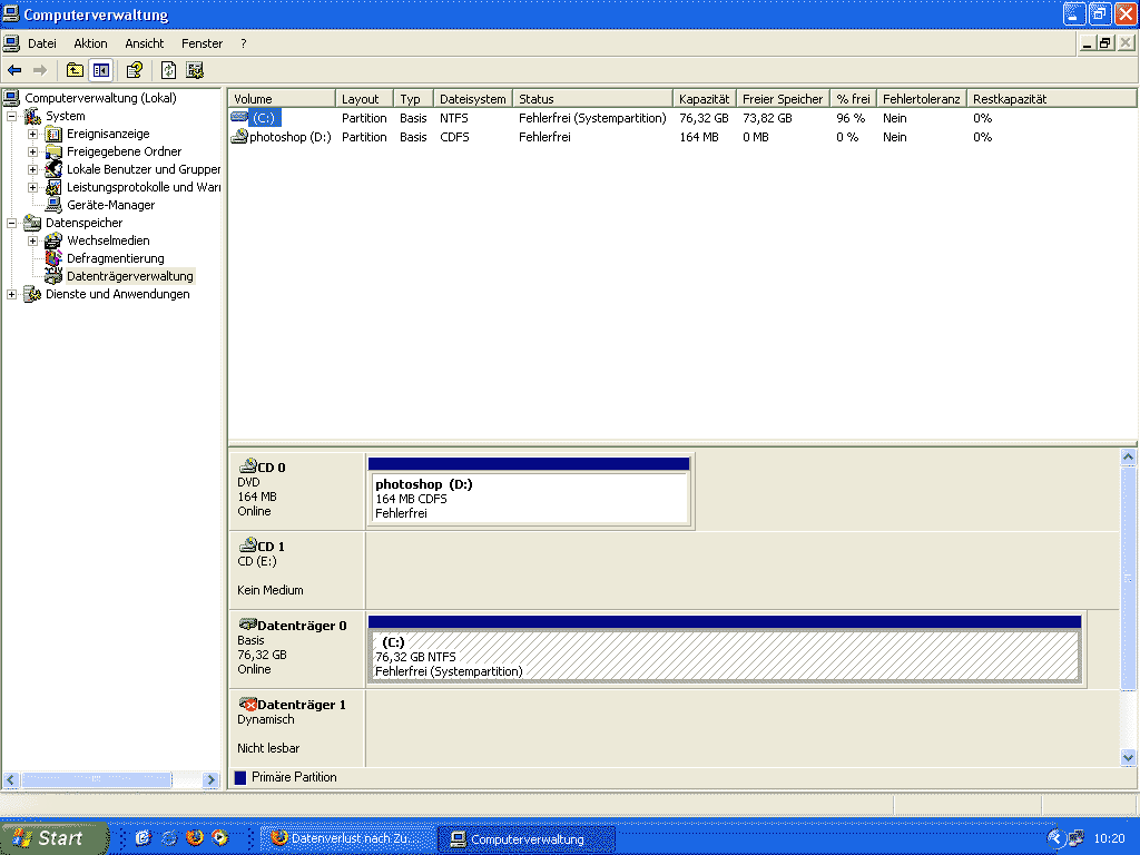 ich habe mir neulich eine neue festplatte von western digital gekauft. ich habe sie eingebaut und alles hat problemlos funktioniert. anschliessend habe ich meine wichtigsten daten auf die festlatte kopiert um dann windows neuzuinstallieren und meine alte festplatte zu formatieren. wenn ich jetzt allerdings auf arbeitsplatz klicke erscheint nur meine alte festplatte nicht aber die neue mit den wichtigen daten. unter datenträgerverwaltung steht nur dass die festplatte nicht lesbar sei. ist es möglich irgendwie wieder an die daten zu kommen und die festplatte wieder im arbeitsplatz anzuzeigen ?