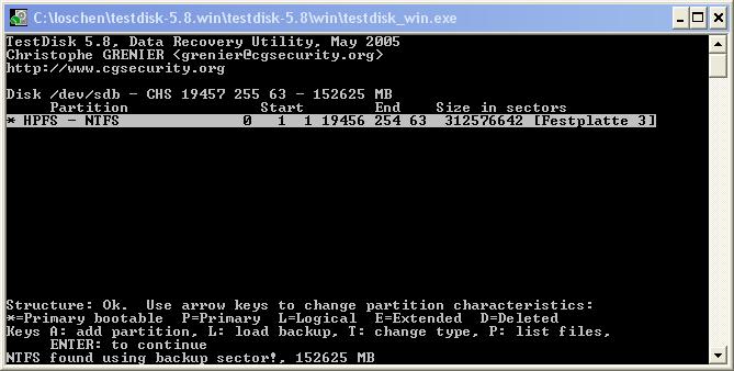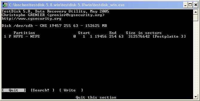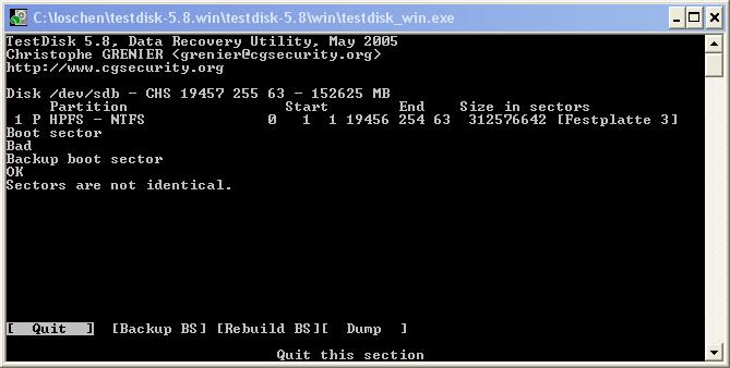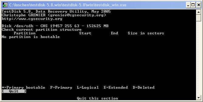 Beende Testdisk jeweils mit Quit.