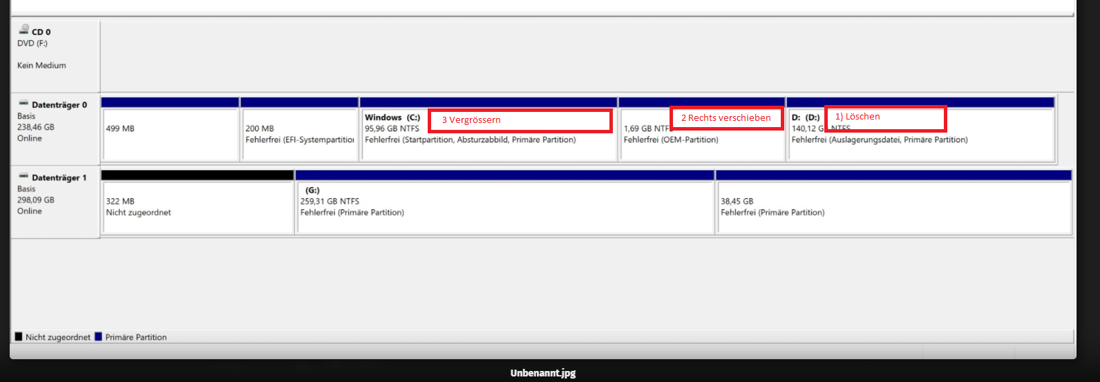 Ja, im Grunde ist sie leer. Es sind nur Dateien drauf die nicht sichtbar sind. Bist du dir sicher dass das keine wichtigen Windows Dateien sein können, die nach Löschung dann alles zerschießen?Fusionator schrieb:Die ist also bereits leer? Dann Rechtsklick auf die Partition und delete current Partition. Danach klickst du oben links auf Save all. Dann sollte freier Platz vorhanden sein. Ich liefere dir gleich einen Screenshot für das weitere Vorgehen.