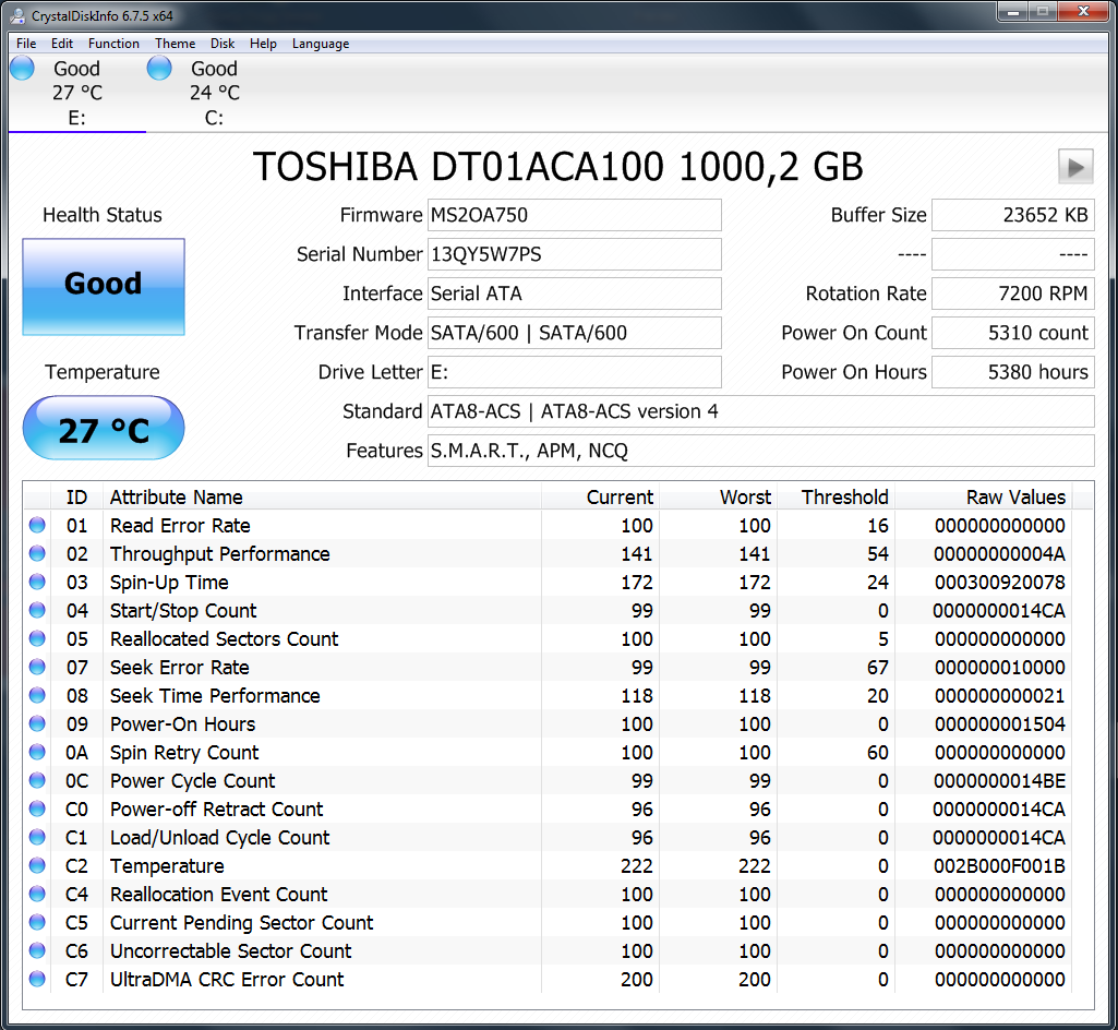 CrystalDisk sagt, dass alles in Ordnung sei und meine Vermutung läuft sehr speziell auf die Festplatte, aber ich möchte sicherstellen, dass im Endeffekt nicht doch das Mainboard der Verursacher ist oder evtl. auch ein defektes Kabel Schuld trägt.