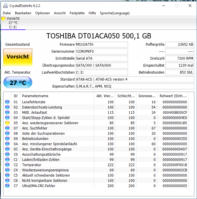 mir an den Status Festplatte als VORSICHT! an. Anbei ein Screenshot vom Ergebnis. Ist die