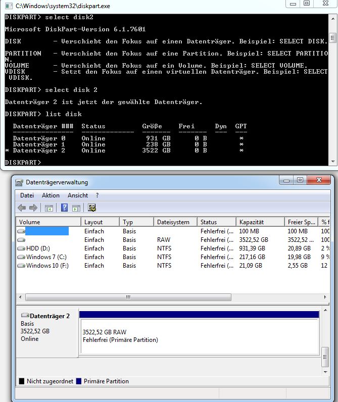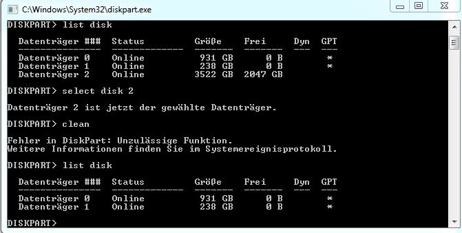 Edit: Da habe ich wohl vergessen, was zu erwähnen, ich habe es auch schon öfters mit diskpart versucht, allerdings bekomme ich auch dort eine Fehlermeldung: