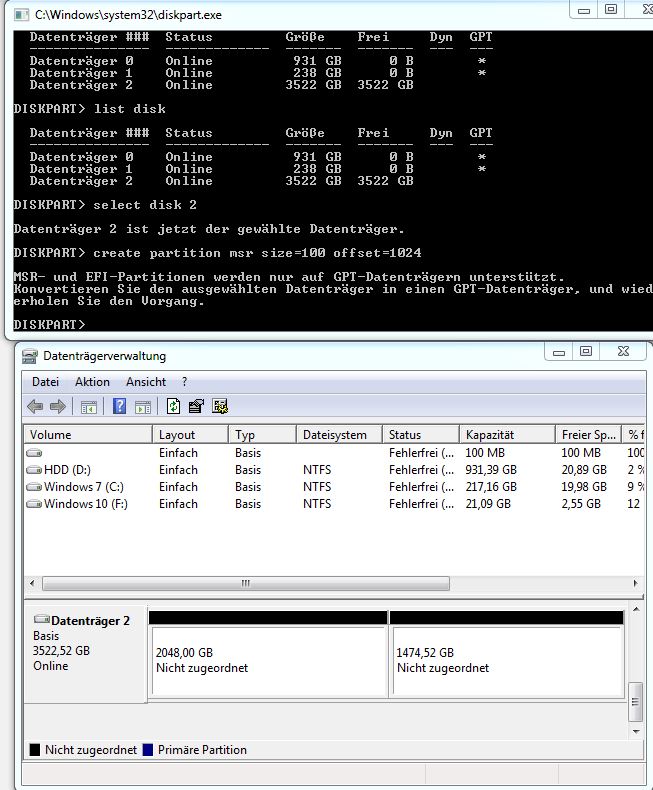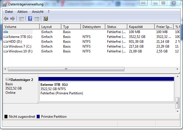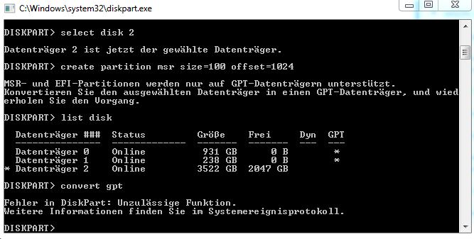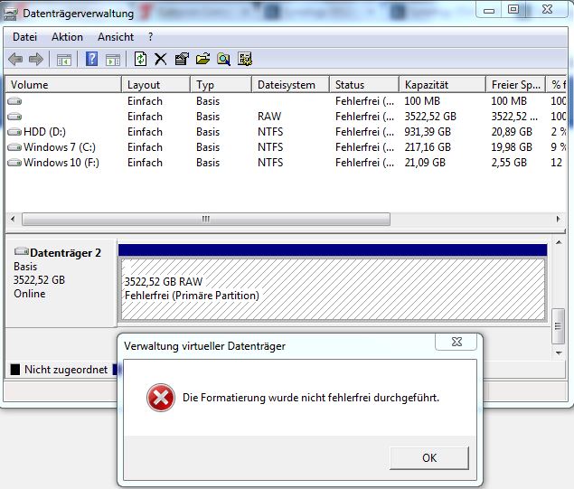 Das komische ist aber auch obwohl die Änderung der Partitionsverwaltung abgebrochen wird, ist sie danach in dem Partitionsstil. Allerdings schlägt die Formatierung unter GPT ganz fehl, bei MBR kann ich aber eine 2TB Partition erstellen und auch aktiv nutzen (Allerdings will ich ja meine ganzen 3TB nutzen.)