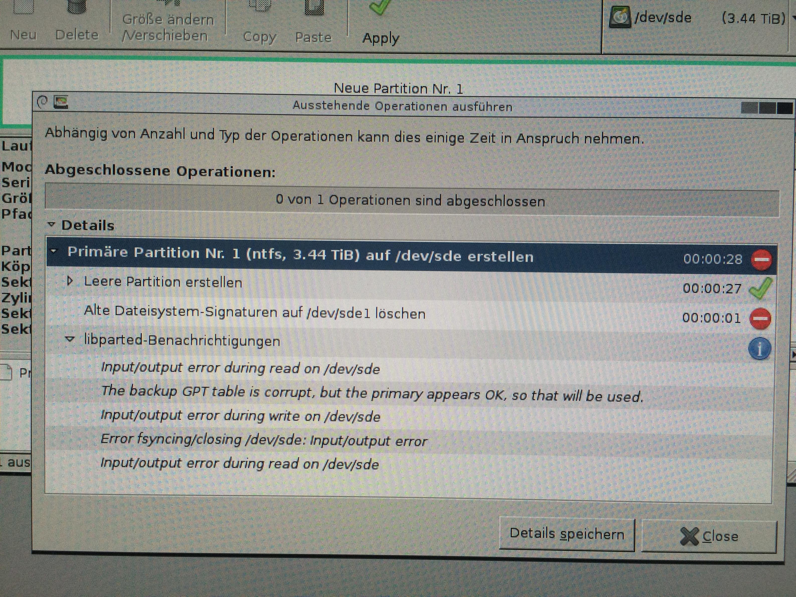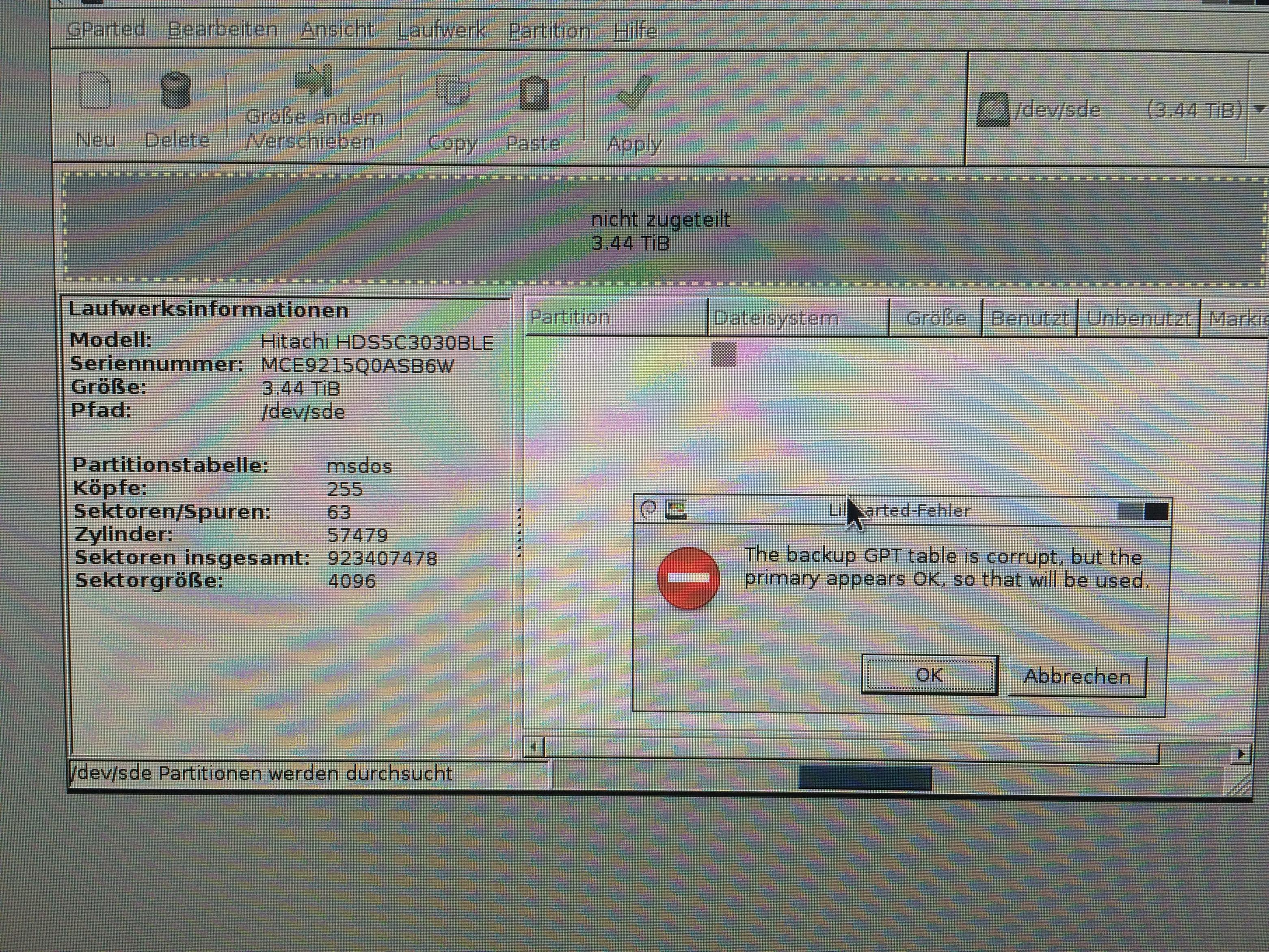Ich habe auch eine Gparted Live Version benutzt und auch da bekomme ich Fehlermeldungen: