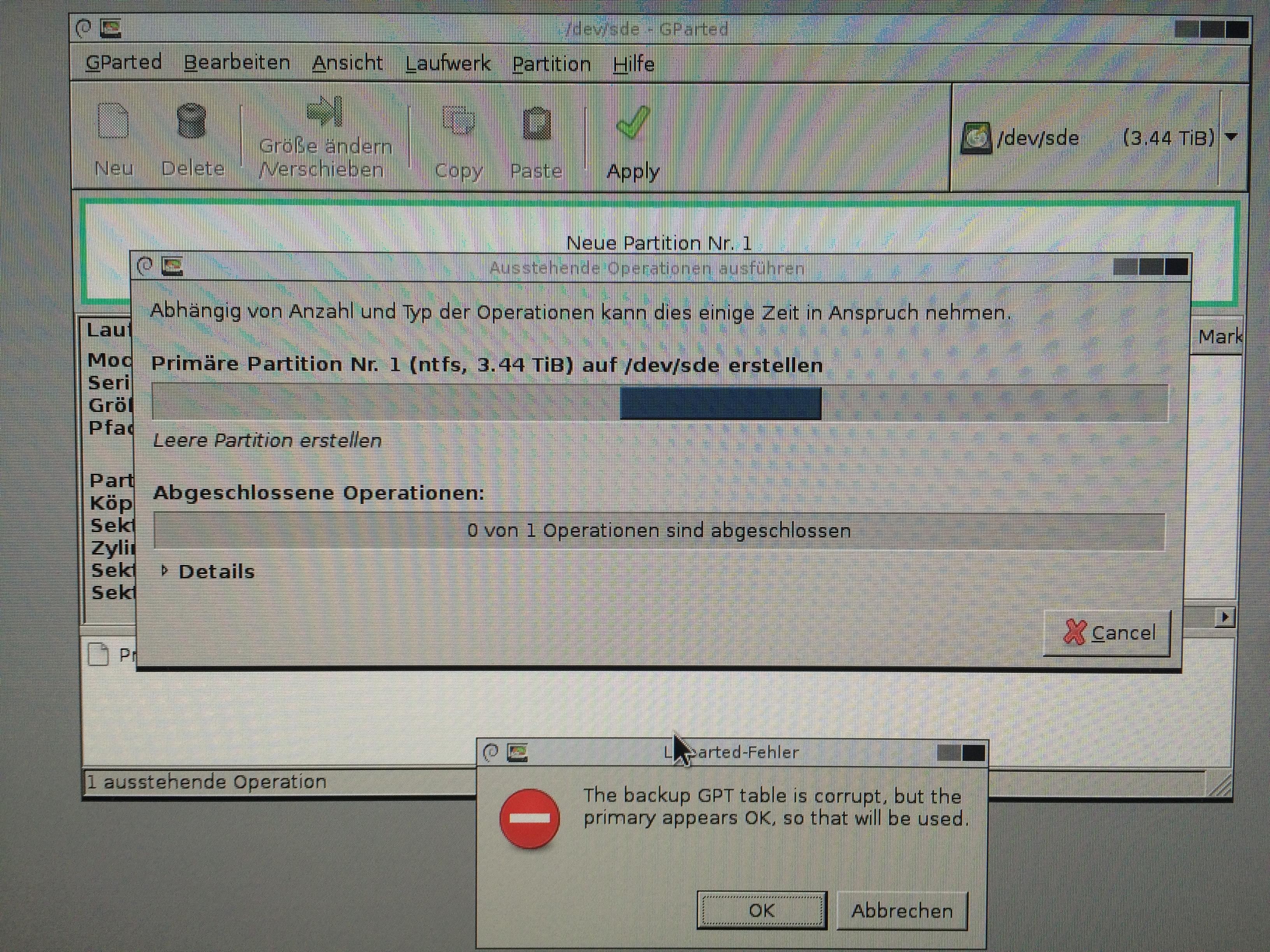 Ich habe jetzt nochmal alles über die Oberfläche von Gparted gelöscht und dann nochmal partitioniert und mit Ntfs formatieren lassen. Da habe ich dann aber natürlich wieder Fehlermeldungen bekommen: