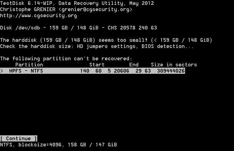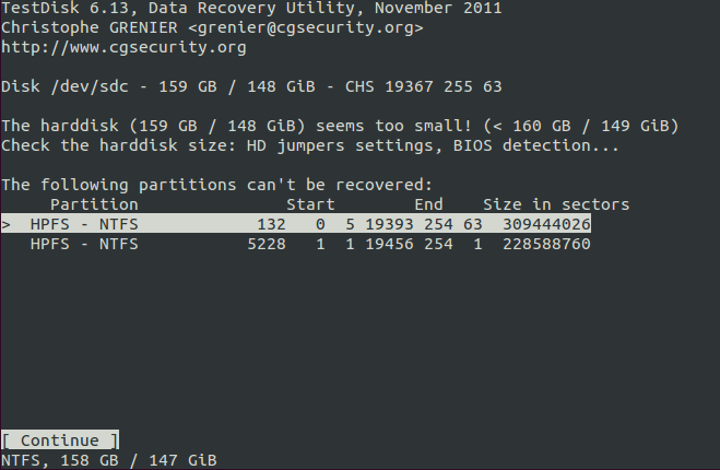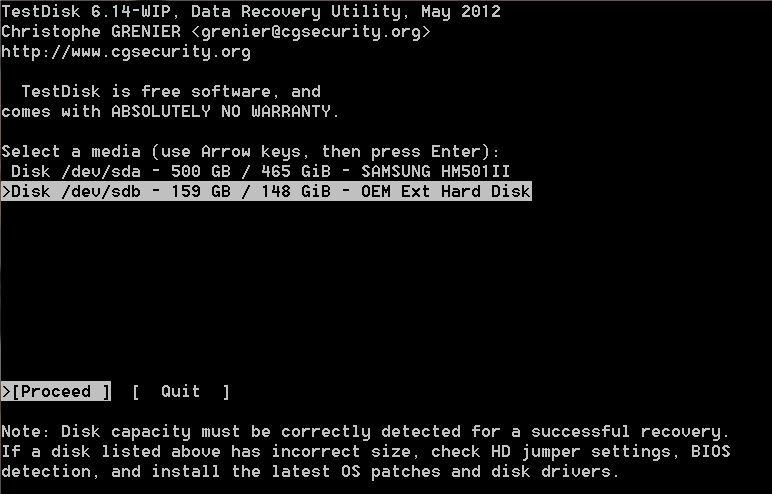 Starte Testdisk, bestätige bei Log-Datei erstellen mit Enter, wähle deine Festplatte und bestätige mit Enter.