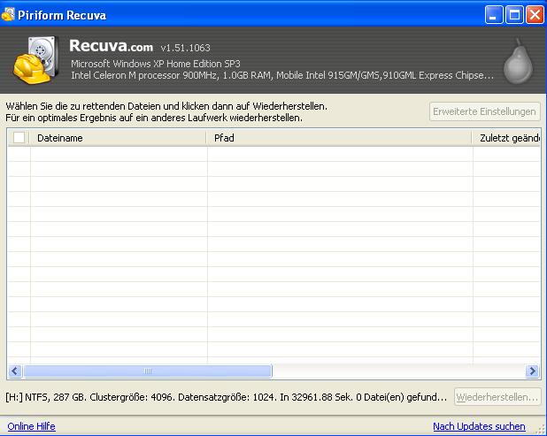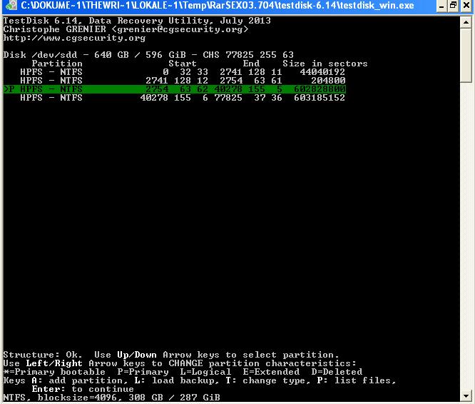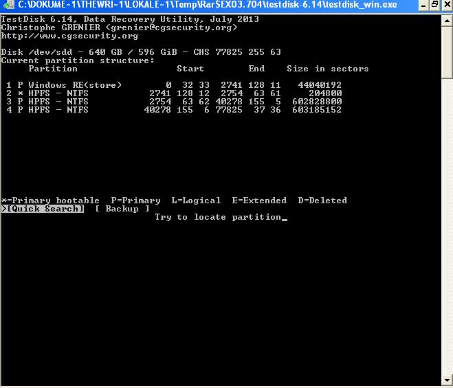 Hier ist der Screenshot nach dem Quick Search mit der markierten Partition. Als ich p gedrückt hab wurden die Daten angezeigt.