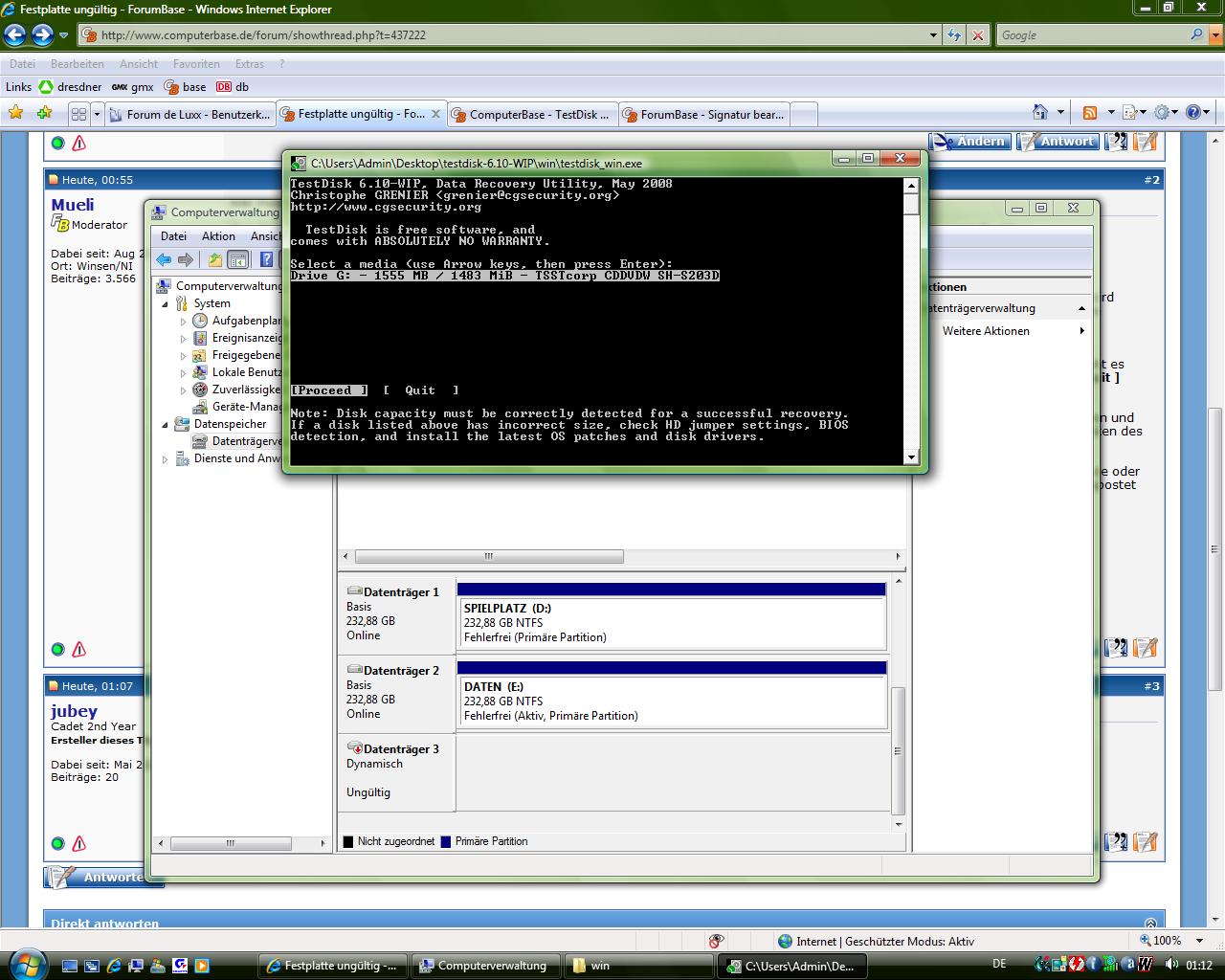 Nun, nachdem ich den Modus nun wechselte blieb Windows beim ersten Ladebildschirm hängen. Also habe ich neugestartet, den Modus wieder auf Raid/Ide zurückgestellt und Windows startete normal. Mein altes Laufwerk indes war vom Arbeitsplatz verschwunden. Also ab in die Computerverwaltung und da die Überraschung: das Laufwerk wird als Ungültig angegeben, die Reaktivierung klappt nicht: "Dieser Vorgang ist auf dem ungültigen Datenträgerpaket unzulässig"