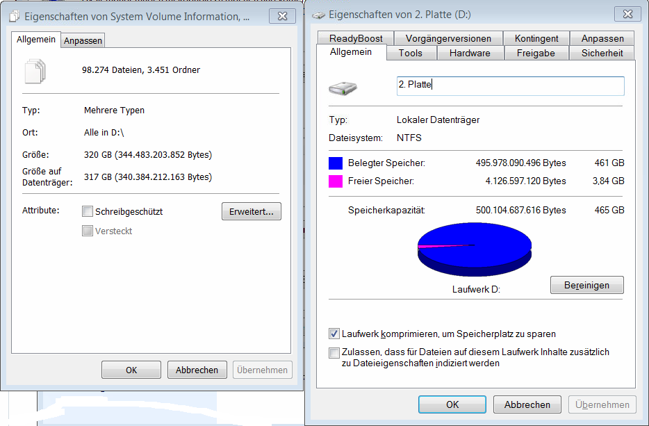 Ich schau also nach, die Datenträgerverwaltung von Laufwerk D: ( das 2. Laufwerk) sagt, dass noch 50kb drauf sind, aber der Backup Ordner ist nur 320gb groß.