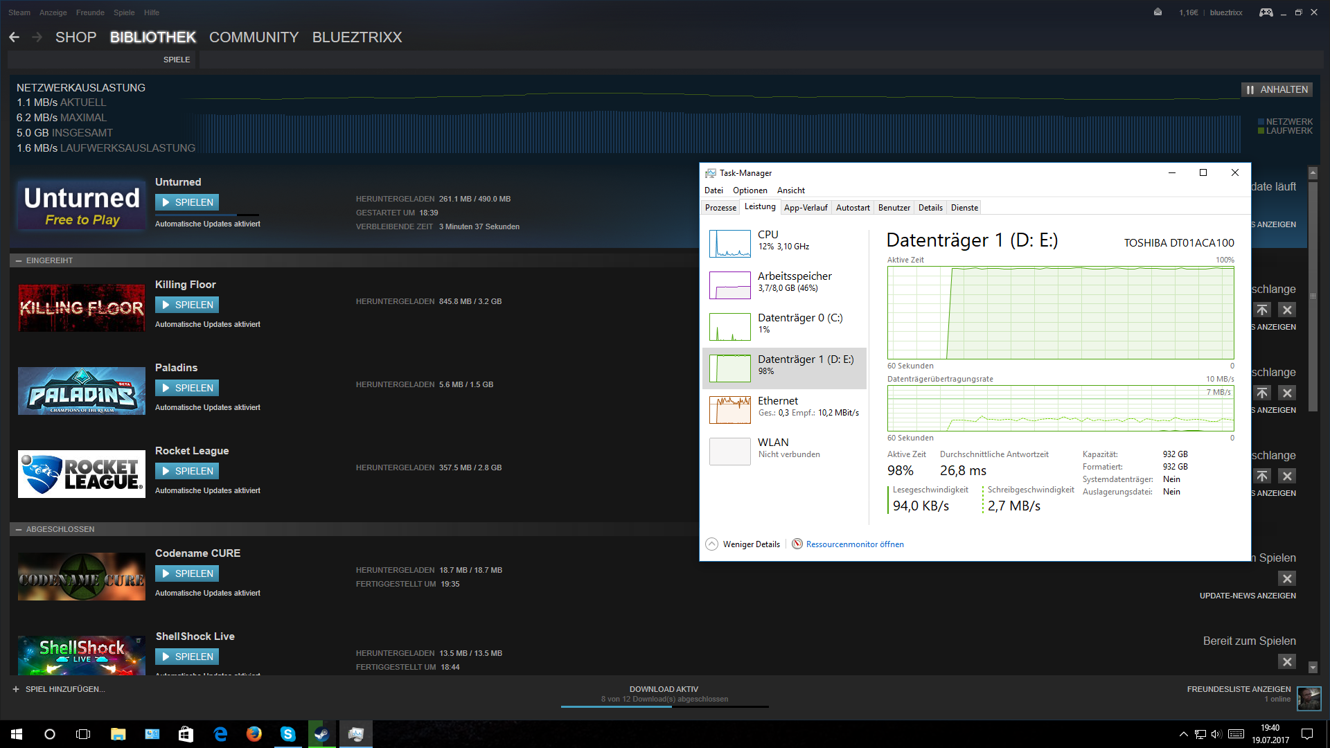 Da ich heute meine 50K Leitung bekommen habe, habe ich Steam natürlich ein paar Spiele und Updates runterladen lassen und dabei habe ich bemerkt dass am Anfang der Download von der Geschwindigkeit passt aber nach einiger Zeit abfällt dann habe ich im Task Manager nachgeschaut und dass bemerkt: