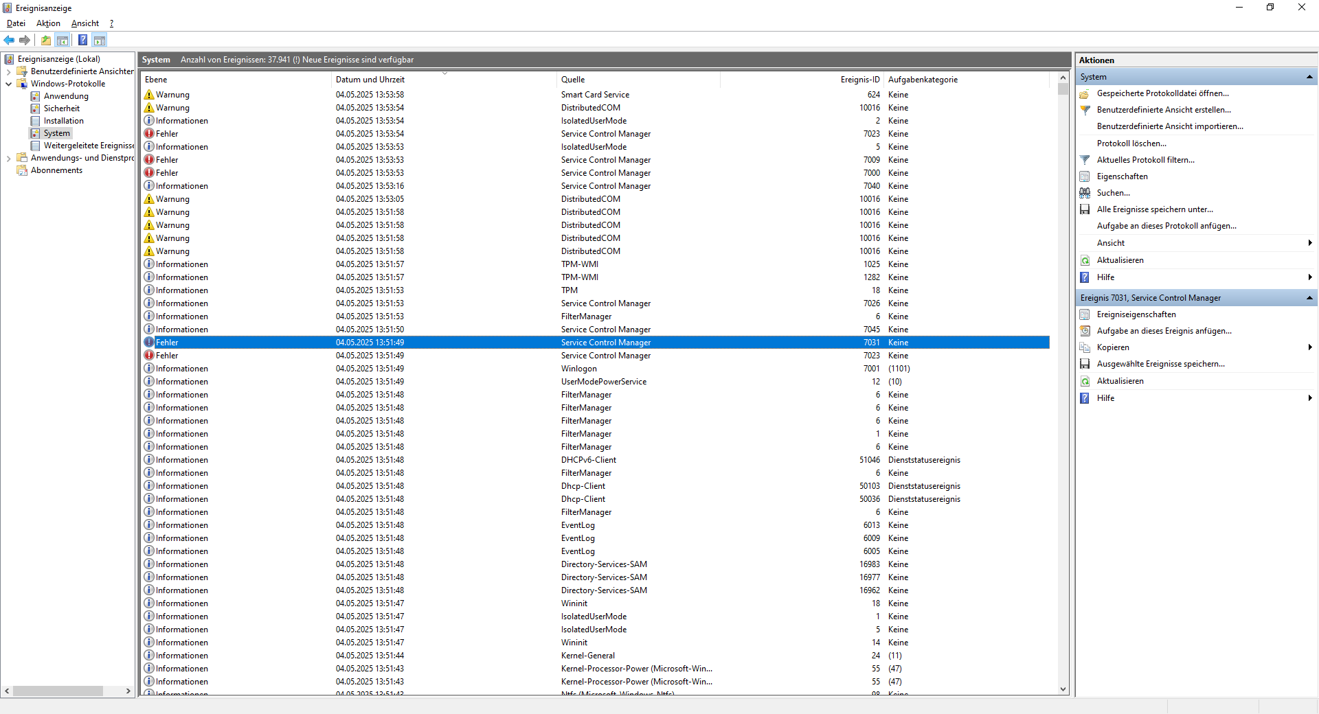 Und was wird unten angezeigt, wenn du den Fehler angeklickt hast? Sieht man auf deinem Screenshot leider nichtMan sieht nur, dass der Service Control Manager mit verschiedenen Ereignis-ID ausgelöst wurde. Also unterschiedliche Ursachen vorliegen.Prof. X schrieb:Hallo nochmal. Ein paar Fehler gibts immernoch, ich habe aber wieder alle Berechtigungen auf meiner D:/, also bin ich auch soweit zufriedenAnhang anzeigen 1614065