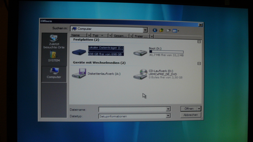 Nun habe ich mich an das Installieren von Windows Vista Ultimate 64-Bit OEM gemacht, und es lief auch alles gut, bis ich ich angeben sollte wohin ich denn Vista installieren möchte, denn in diesem Fenster wird keine Festplatte zur Auswahl angezeigt.