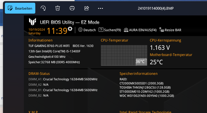 - Mainboard: TUF GAMING B760-PLUS WIFI ( Bei dem Pfeil habe ich die Festplatte mit einem SATA Kabel verbunden), Strom habe ich auch mit der Festplatte verbunden.