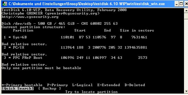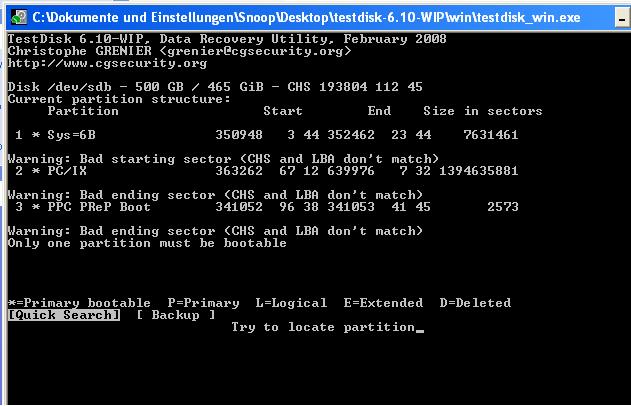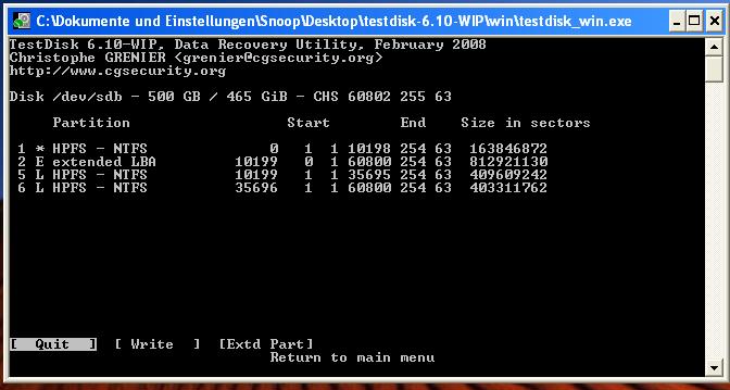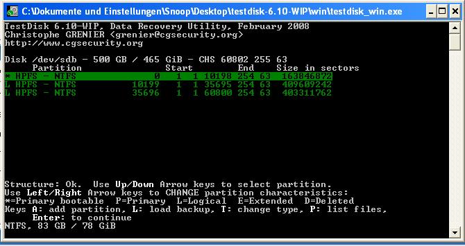 Also hab ich Testkdisk laufen lassen. Leider bin ich kein Festlattenkrack (sonst würds ja laufen
