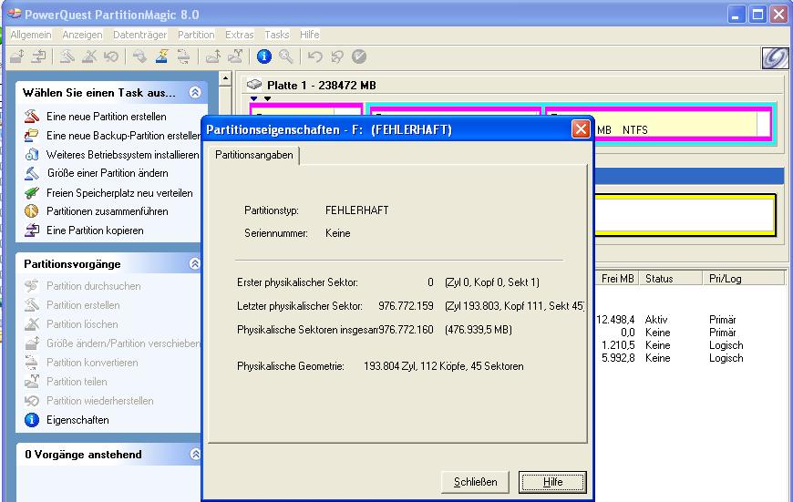 Ach ja, die Platte hat (hatte) 3 Partitionen. Da war noch nichts wichtiges drauf. Ich muß also keine Daten retten.