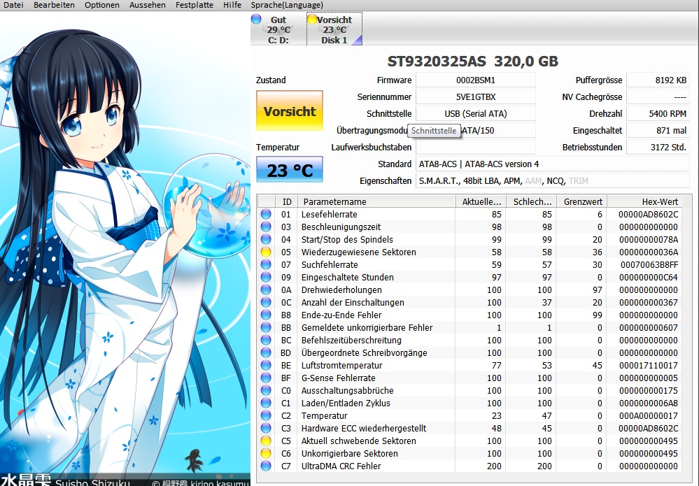 Die HDD hat 874 wiederzugewiesene Sektoren, die defekt waren und mit Reservesektoren ersetzt wurden, sowie 1173 schwebende, die nicht gelesen werden konnten und vielleicht defekt sind und ebenso viele, die defekt sind auf darauf warten, beim nächsten Überschreiben remappt zu werden. Bei einer so großen Zahl kann man davon ausgehen, dass weitere dazukommen bis die HDD nicht mehr erkannt wird.