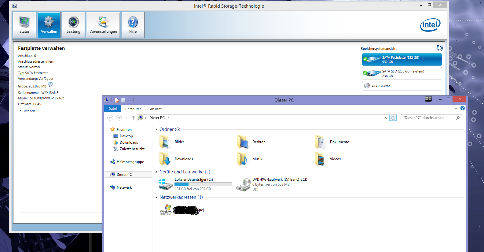 ich hätte mal eine Fragen, habe mir letztens einen Pc zusammengebaut und hatte ein Satakabel zu wenig, deswegen habe ich erst meine SSD und mein Laufwerk angeschlossen ( Um W8 zu installieren). Heute habe ich dann ein weiteres Kabel geholt und meine HDD ganz normal angeschlossen. Sie wird jetzt zwar von dem Intel Rapid Storage Programm erkannt aber sonst wird sie nirgendswo erkannt. Beim Explorer ist nur meine SSD und mein Laufwerk zu erkennen. Weiß jemand wie ich das Problem lösen kann ?