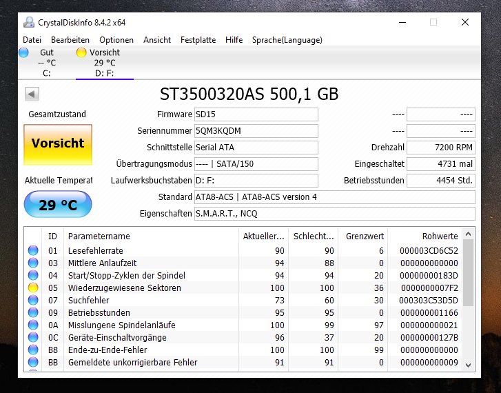 Also CrystalDiskInfo sagt mir "Vorsicht", kann die vielen Zahlen zwar nicht deuten, jedoch werde ich die Platte wohl so schnell wie möglich tauschen müssen.