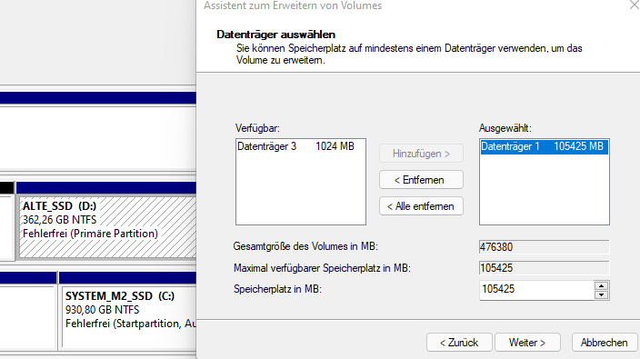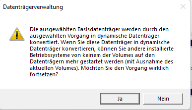 Wenn ich das Volumen der primären Partition erweitern möchte, kommen alle normalen Dialog Felder, bei der Auswahl der Größe habe ich das maximal Verfügbare genommen (105,425 GB | 105425 MB) anschließend folgt die Warnung [Ausgewählte Basisdatenträger in dynamisch konvertiert ... , Betriebssystem keines der Volume mehr gestartete ...] , wenn ich dann auf Fertigstellen klicke folgt die Fehlermeldung [Auf mindestens einen Datenträger nicht genügend Speicherplatz um Vorgang abschließen zu können] . Tja hier weiß ich nicht mehr weiter.