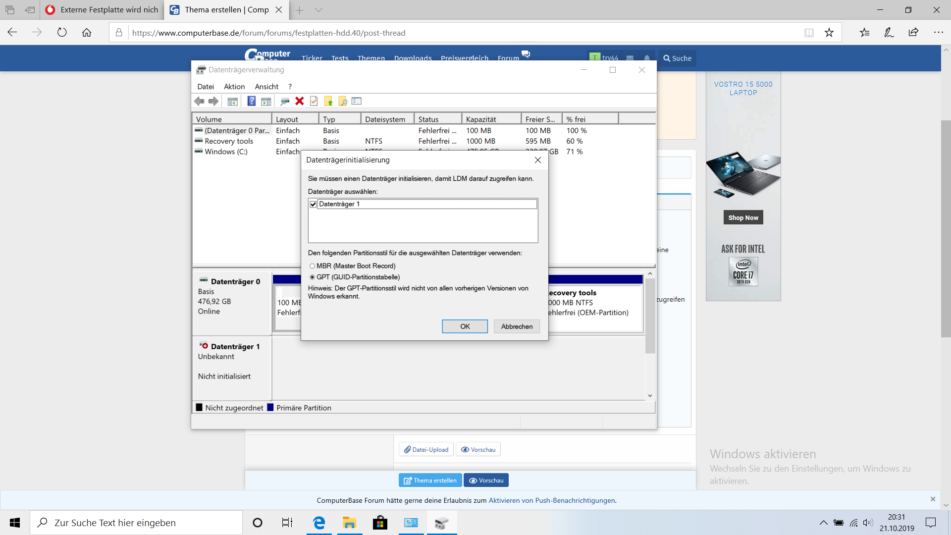 Beim Aufrufen der Datenträgerverwaltung erscheint die Meldung "Sie müssen einen Datenträger initialisieren, damit LDM darauf zugreifen kann". Dann kann ich einen Partitionsstiel auswählen, MBR oder GPT. Screenshot im Anhang.