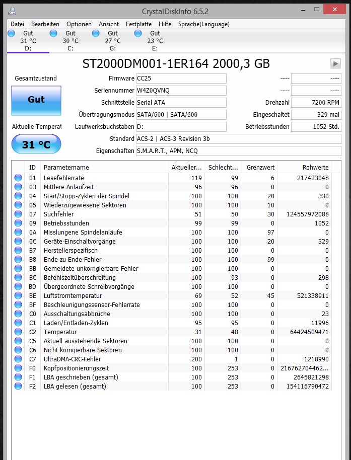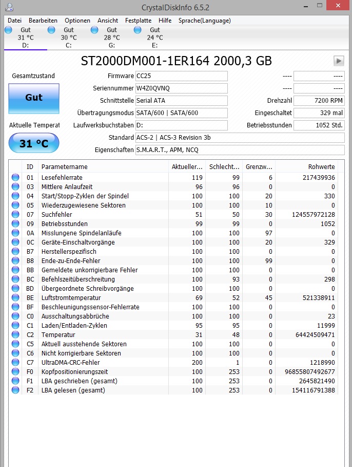 Crystal Disk zeigt mir nun diese Werte an: