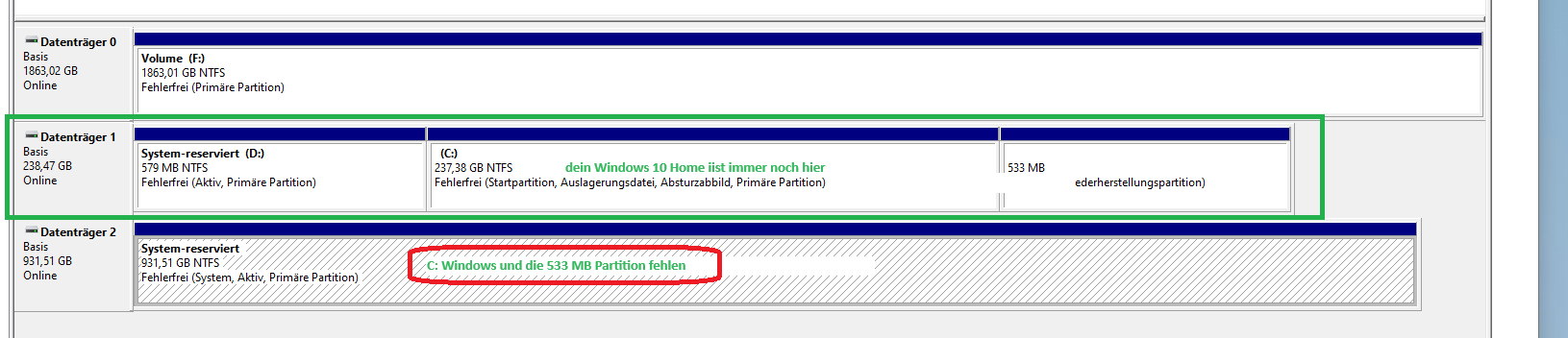 In den beiden Bilden deiner Datenträgerverwaltung sieht man dein Windows 10 nur auf der 250 GB SSD.