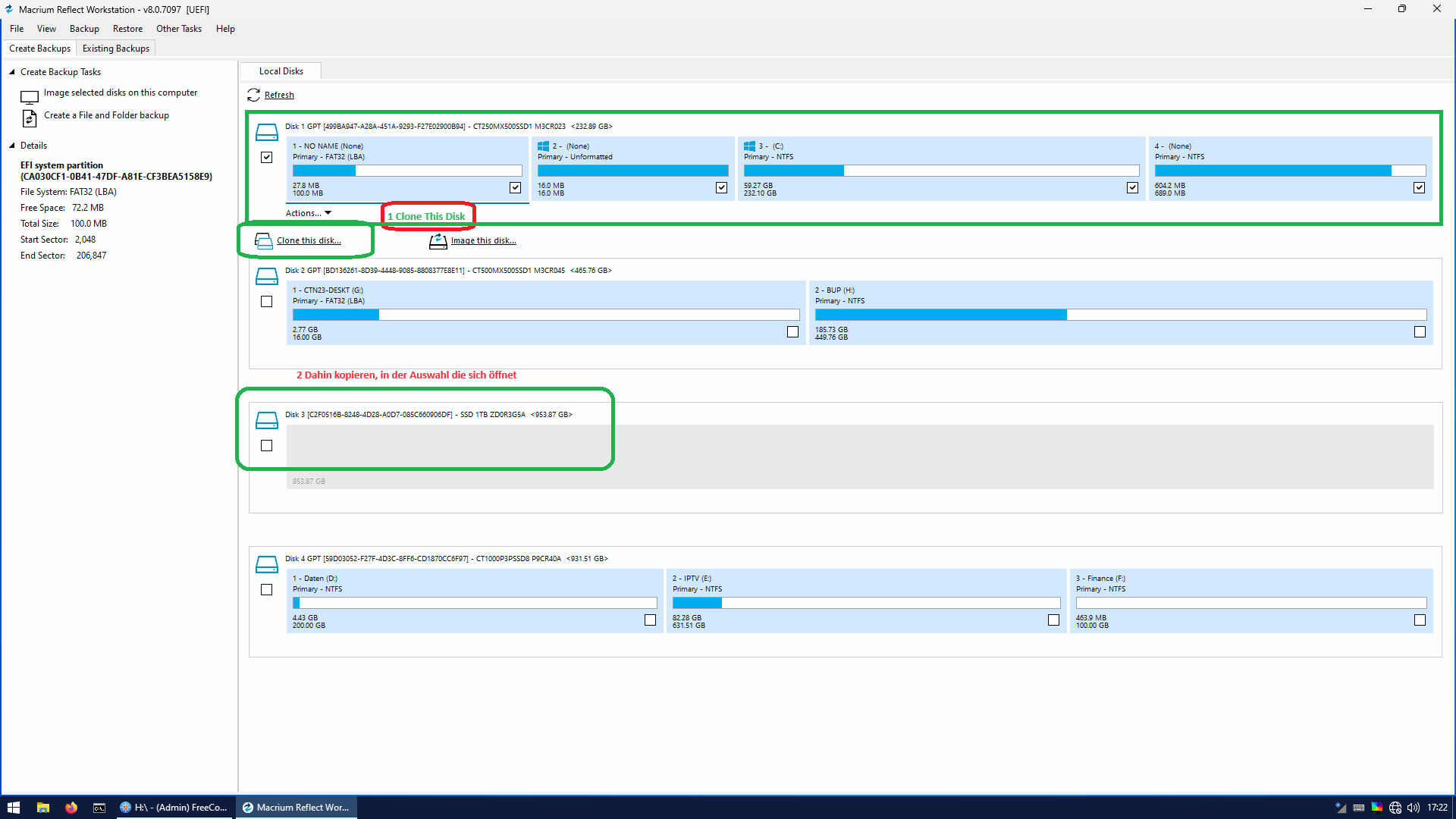 Also, wenn ich Du wäre, würde ich als erstes Datenträger0 Volume (F) abklemmen, sicher ist sicher, dann vom Datenträger1 ein Komplett Backup machen, Persönlich benutze ich Acronis 2016 mit Bootable USB Stick, Datenträger2 mit Partition Wizzard löschen, dann das Backup zurück auf Datenträger2 schreiben, dann Datenträger1 abklemmen und von Datenträger2 Booten, sollte eigentlich klappen