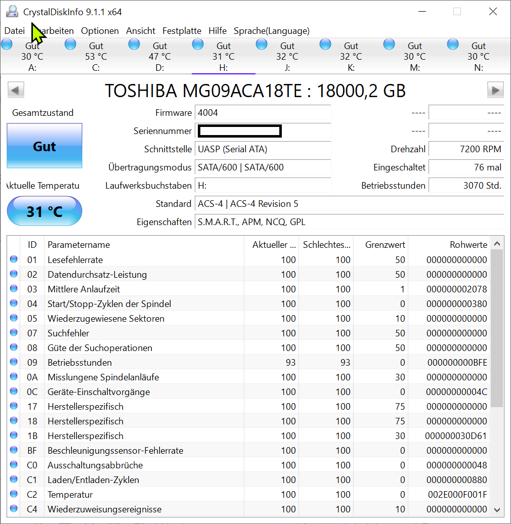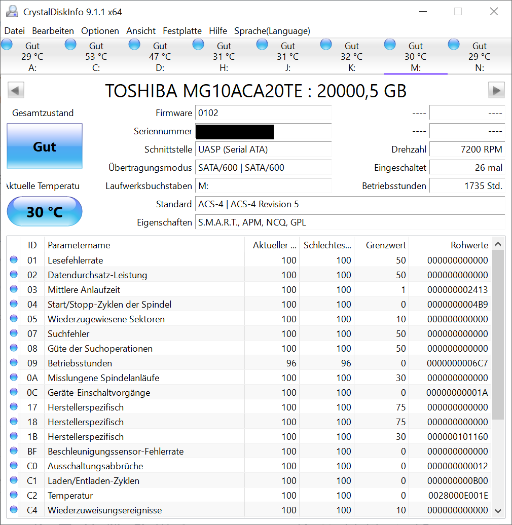 Hat jemand eine Idee, woran es liegen kann und was ich noch ausprobieren könnte? Ich hänge noch Screenshots von CrystalDiskInfo an. Die Laufwerke H und K sind 2 von 5 betroffenen Laufwerken, M läuft normal. Dank im Voraus!