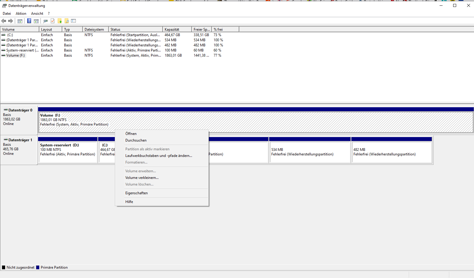 Im PC sind 2 Festplatten verbaut. Eine als Systenpartition (C:, 500GB) und eine als zusätzliche interne Festplatte (F:, 2 TB). Ich hatte nun vor, erst die interne Festplatte F: zu formatieren und danach die Systempartition. Allerdings fängt das Problem hier an - wenn ich in die Datenträgerverwaltung gehe, ist bei F: "formatieren" ausgegraut. Auch wenn ich im Datenbrowser per Rechtsklick auf F: gehe und "Formatieren" anklicke, kommt nach dem nächsten Fenster sofort "Windows konnte die Formatierung nicht abschließen". Ich hänge mal ein Bild mit der Datenträgerverwaltung an. Mir ist aufgefallen, dass F: als aktive Sytempartition markiert ist, aber eigentlich ist Windows auf C: installiert. Liegt es daran? Soll ich C: als aktiv markieren und kann danach erst F: formatieren? Allerdings bootet Windows ja ganz normal, also falsch markiert scheint das nicht zu sein.. oder?