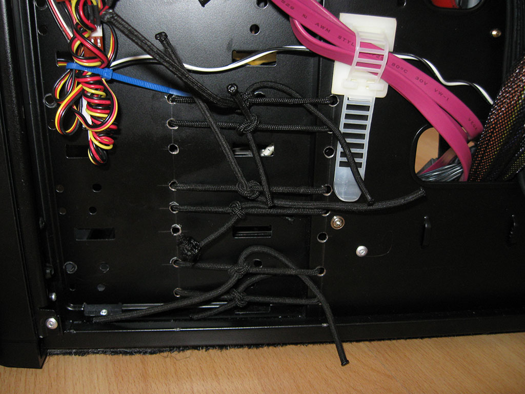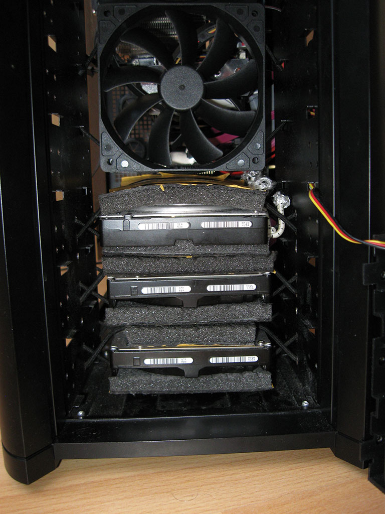 Ich schneide eine Gummiplatte so zurecht, dass sie der Gehäusegröße einer 3,5“ Festplatte entspricht, baue die Einbauschienen an die Seite und schiebe dieses Konstrukt dann in den Festplattenkäfig. Die Festplatte selbst lege ich auf die Gummiplatte und schraube sie von unten her fest. (Bilder zur Erläuterung was ich meine sind im Anhang, grün = Festplatten, orange = Einbauschienen, dunkelgrau = Gummiplatte)