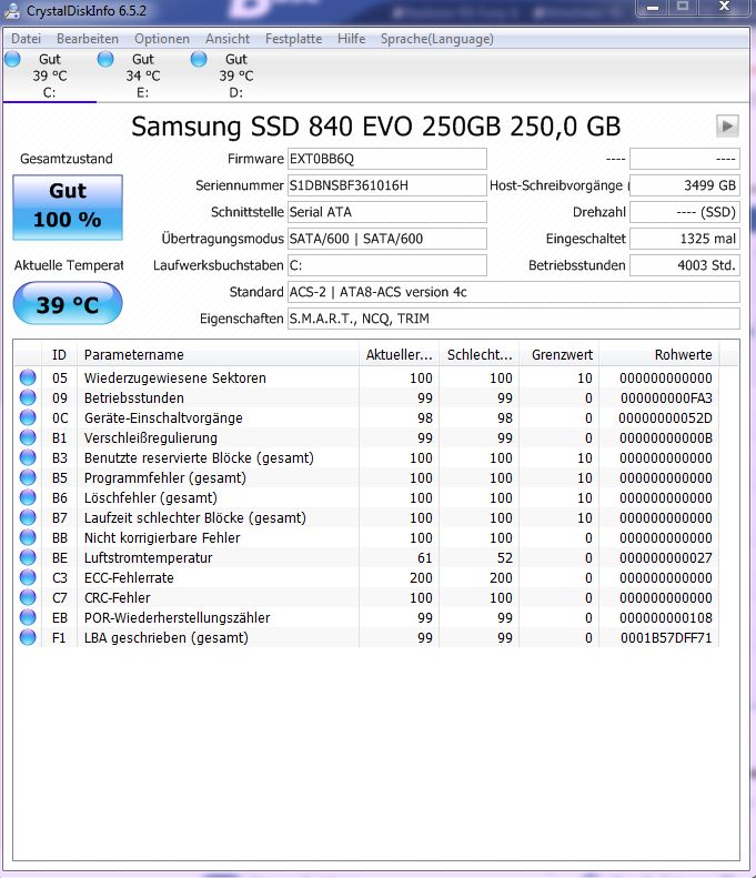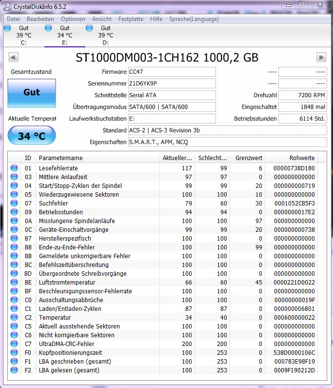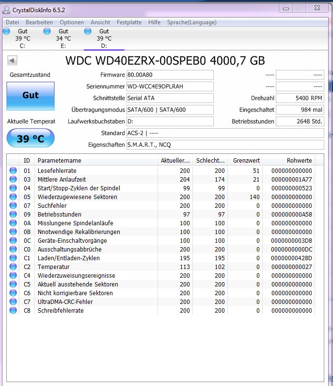 Ich würde gern wissen ob es an einer Festplatte liegt deswegen habe ich mal CrystalDiskInfo Screens gemacht und wollte fragen ob ihr irgendwelche Auffälligkeiten sehen könnt.