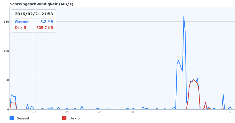 Schiebe ich da große Archive per FTP auf die HDD, pendelt sich bei mir das Ganze auf rund 50 MB/s ein, was dann zwischen 47 und 53 MB/s schwankt aber durchgehend.