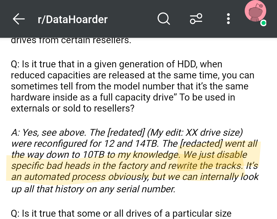 Zum Beispiel wenn sich bei einer fertig produzierten Platte im Test herausstellt, dass einer oder gar mehrere dieser Köpfe defekt sind. Die betroffenen Köpfe werden dann typischerweise per Firmware lahmgelegt und die Platte mit geringerer Kapazität verkauft, dann natürlich nicht als offizielle Ware (da diese Platten dann nicht mehr die dort üblichen Specs erfüllen, was Stromverbrauch, Lautstärke etc. angeht) sondern halt über Schienen wie externe Platten zu denen der Hersteller klar dazu schreibt dass sie keinerlei Eigenschaften der verbauten Platten zusagen mit Ausnahme der (nominalen / nutzbaren) Kapazität.