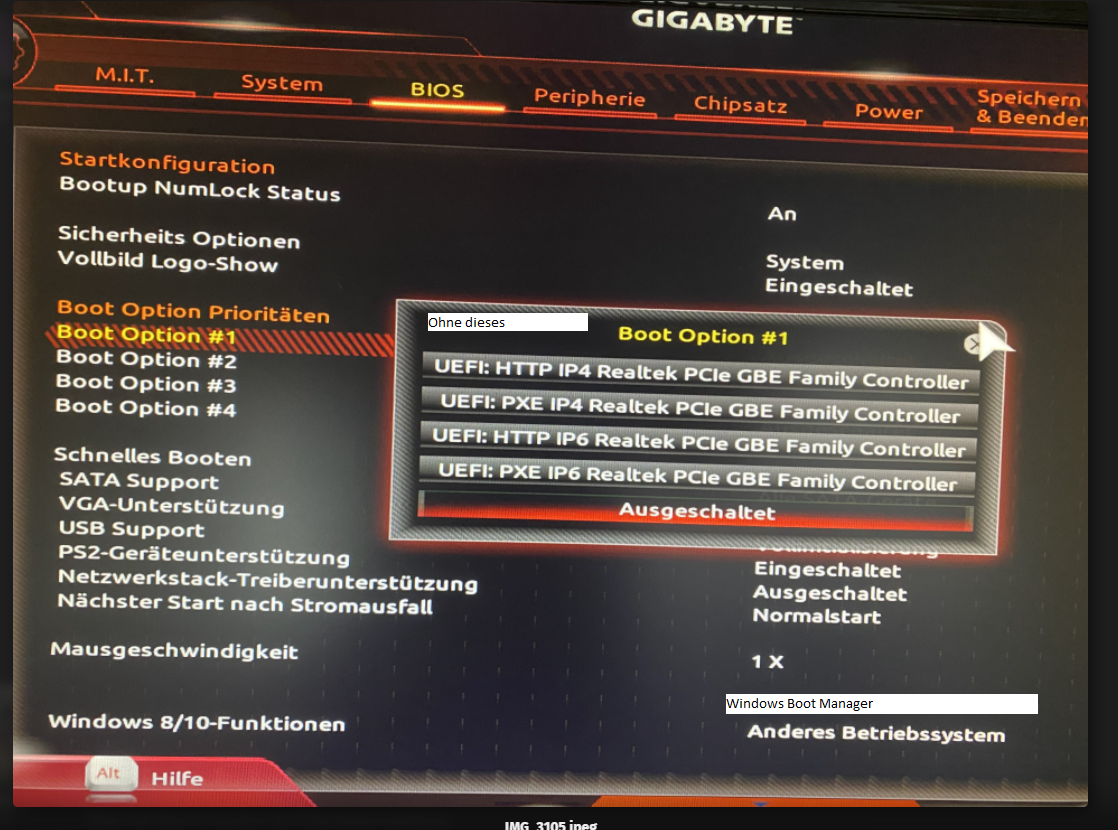 habe mir einen Gebrauchten Pc gekauft und habe mit einem USB Stick Windows 10 neu installiert. Leider kann ich im Boot Menü keine Festplatte anwählen (siehe Foto), somit kann er auch nicht auf die Festplatte Booten, also ich komme nicht ins Windows. Ich finde leider auch nicht im Bios die funktion, wo ich es einschalten kann. Unter die Option Sata, werden die Festplatten im Bios erkannt, ich konnte ja auch Formatieren.